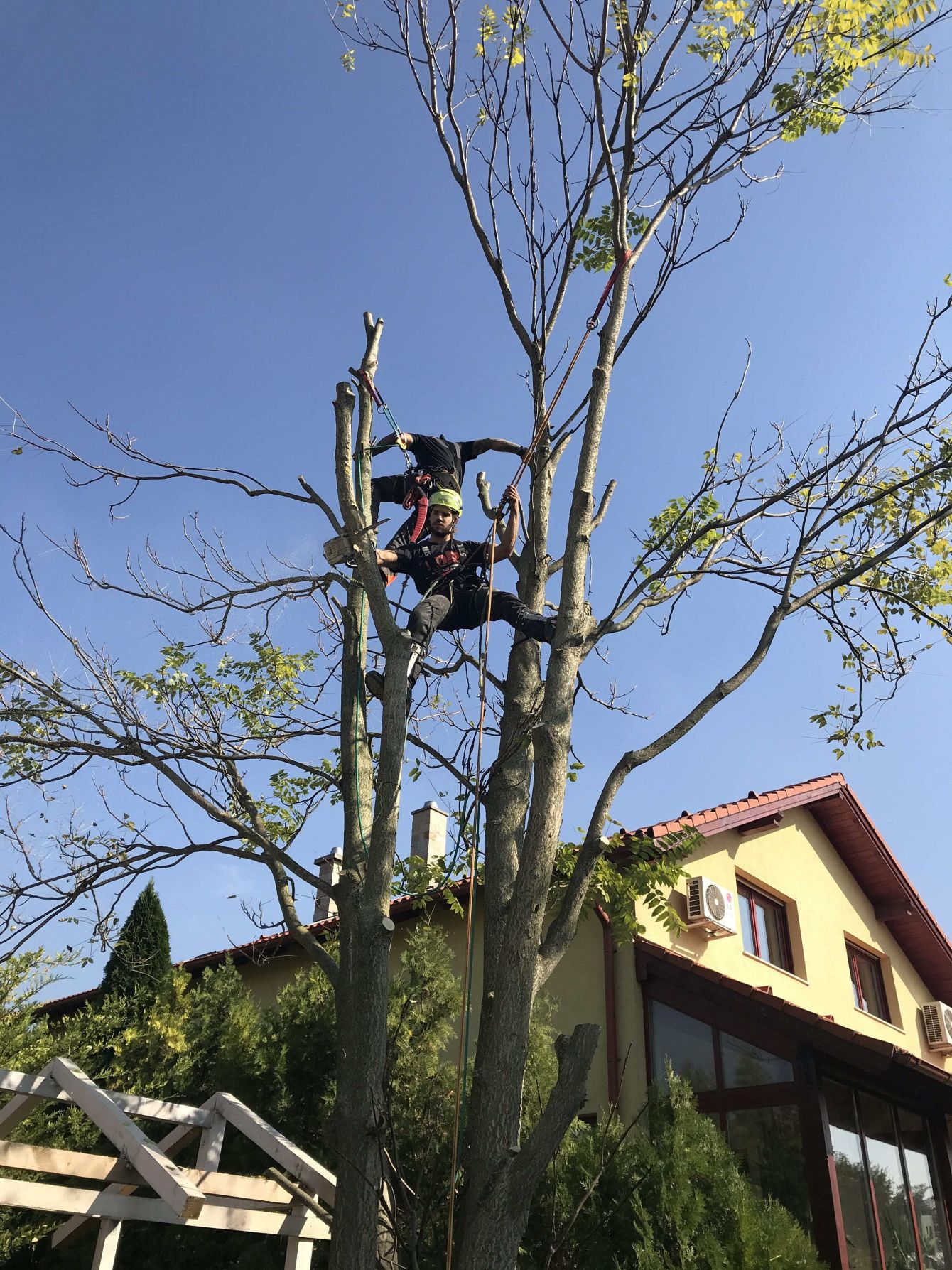 Ezután még eltávolítottunk pár halott ágat egy fiatal diófáról, illetve egy akácról. Takarítottunk és indultunk is tovább Telki felé ahol egy fiatal bálványfát kellett 1/3 -ára redukálnunk közvetlenül a kerítés mellett egy kis faépület felett.