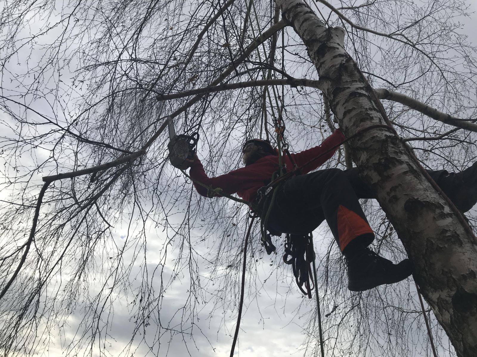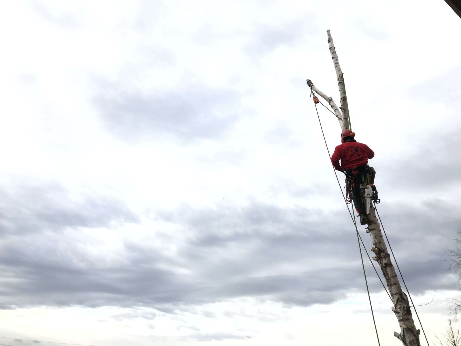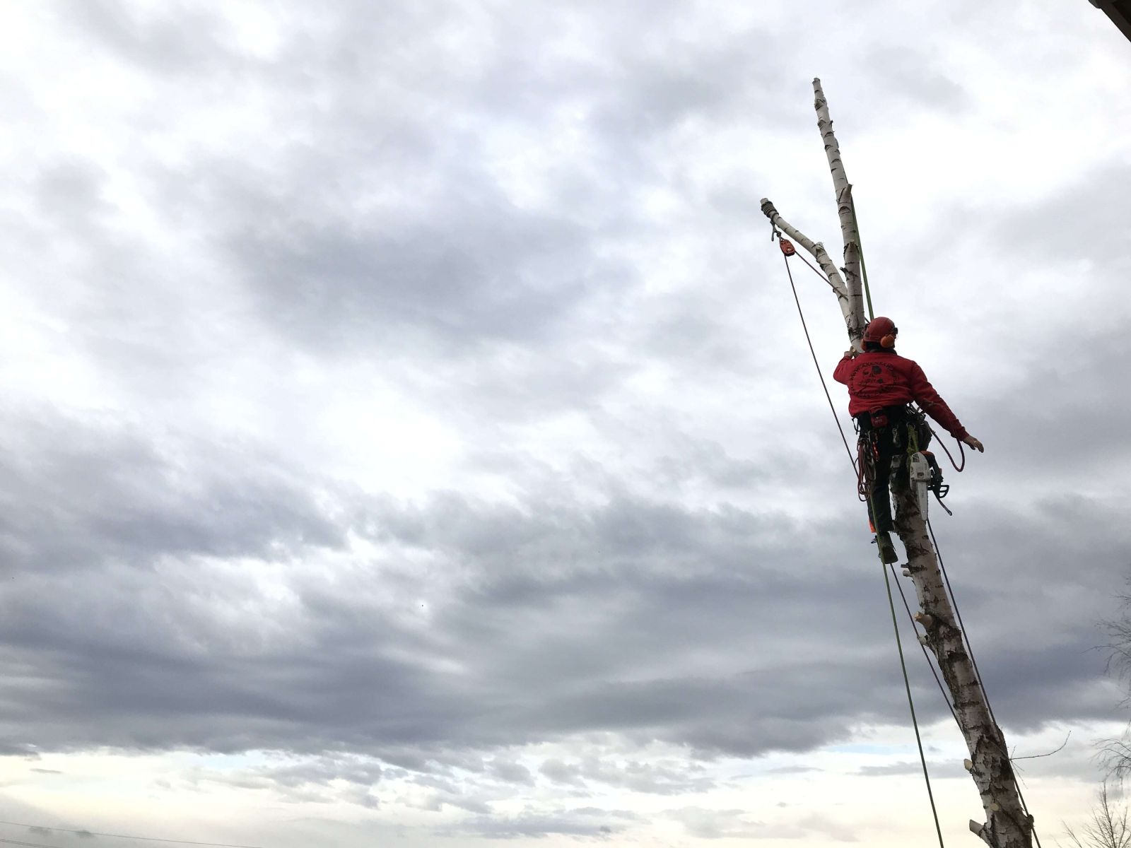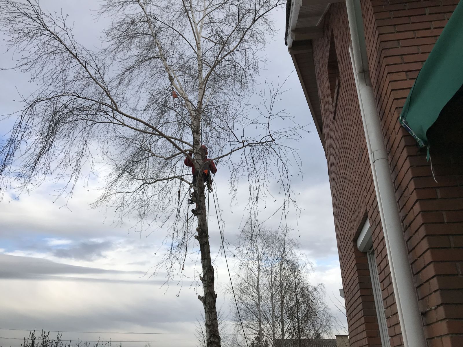 Fiatal nyírfa biztonságos eltávolítása talajszintig alpintechnikával Biatorbágyon, közvetlenül épület mellől.