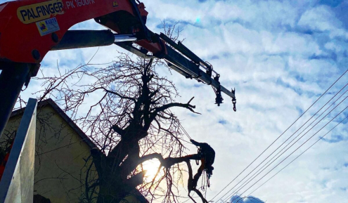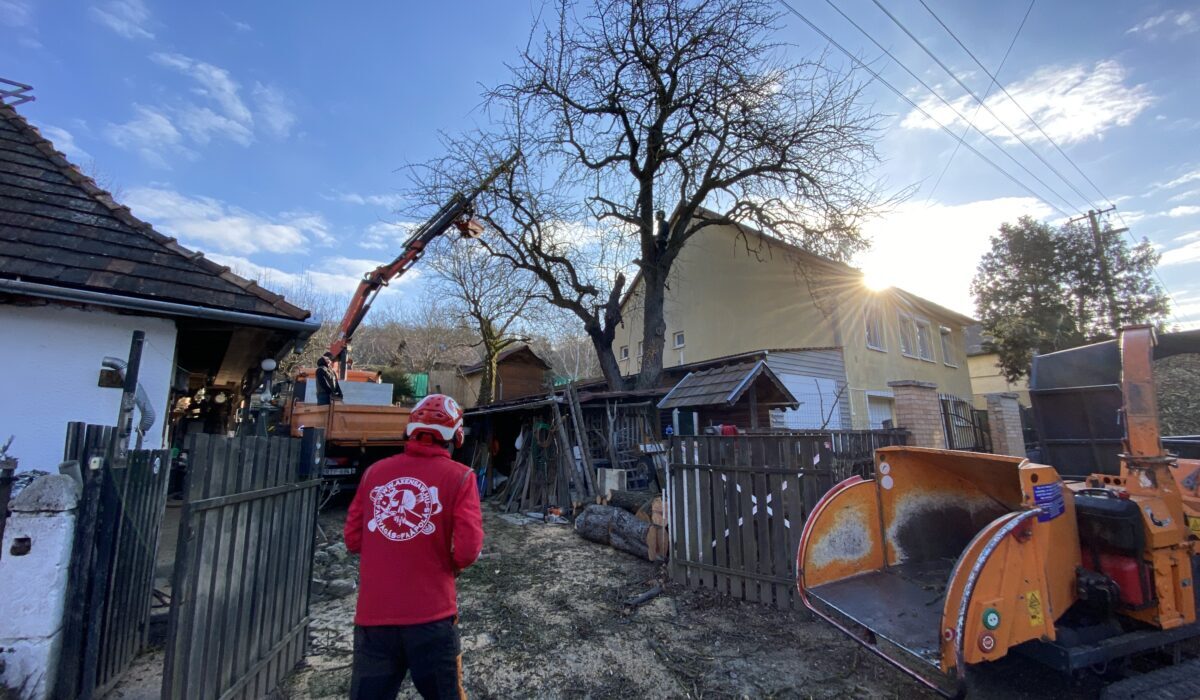 A nehézkes kitalpalást követően a munka gördülékenyen ment végbe, a keletkező zölldhulladékot helyszíni gallyaprítást követően elszállítottuk, a faanyagot az utcán deponáltuk.