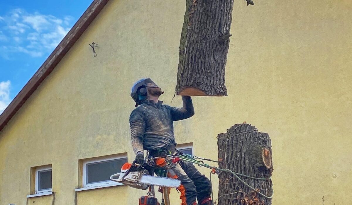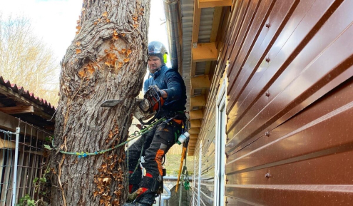 Amikor az ejtési terület közel a nullával egyenlő akkor a fakivágás leghatékonyabb módja a daruzás, csakhogy ebbe a szűk udvarba nem fért be az általánosságban favágáshoz használt autódaru, ezért egy KCR-es autót kellett segítségül hívnunk.