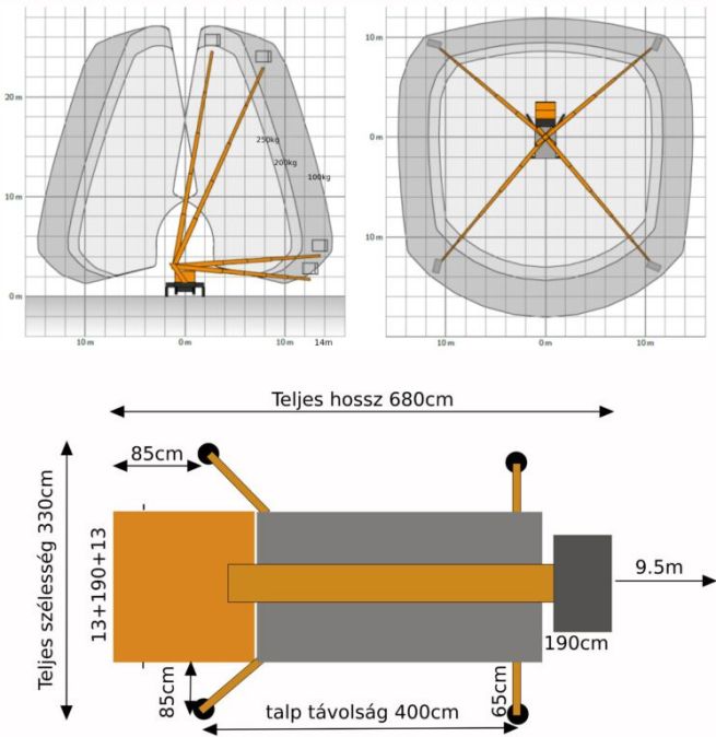 A gép képes közvetlenül maga alá is talpalni viszont ilyenkor a forgása 15-15 fokra korlátozódik a munkamagassága pedig 20m-re.