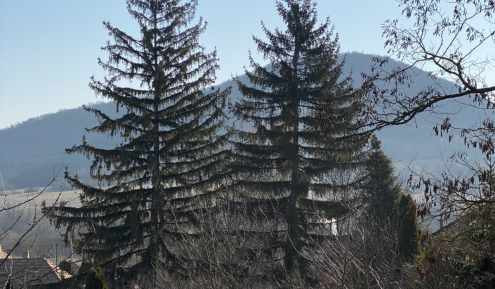Az elmúlt időszak rendszeres esőzései során felázott talaj és a heves szélviharok miatt ez a két hatalmas fenyőfa veszélyessé vált a közvetlenül mellettük álló családi házra, ezért szépségük és megfelelő vitalitásuk ellenére eljött az idő a kivágásra.